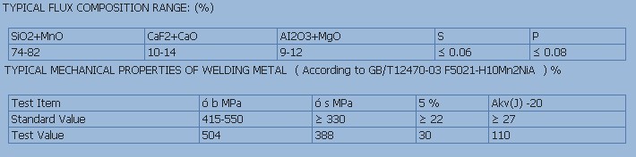 APPLICATIONS: In combination with H108A\H08MnA and H10Mn2 wires, this flux is suitable for welding of low carbon steels and some low alloy steel such as 16Mn\15MnV in producing of structures, boiler, ships, pressure vessels, etc. It cn also be sued for electroslag welding. GUIDELINES FOR USAGE: 1. Dry the flux at 250 for 2 hours before use 2. Completely remove rust, oil and dirt from the groove surface prior to welding.
