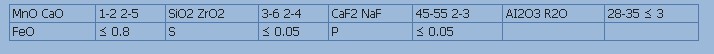 GUIDELINES FOR USAGE: 1. Dry the flux at 300-400 for 2 hours before use. 2. Completely remove rust, oil and dirt from the groove surface prior to welding. TYPICAL FLUX COMPOSITION RANGE: (%)